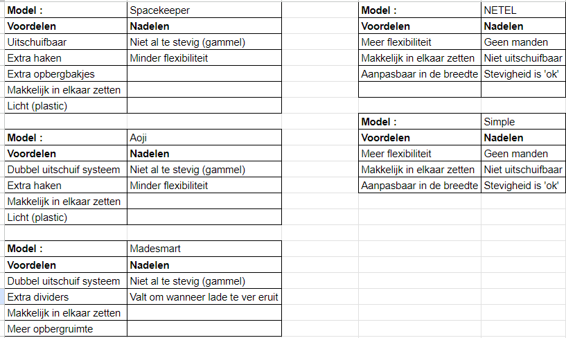 Klanten wensen dus 1) meer flexibiliteit zoals het kunnen aanpassen van de grootte 2) een steviger design 3) een rek dat groter is of meer opslagruimte 4) een model dat makkelijker te bereiken is, bv. door middel van een ‘slide-mechanism’ en 5) dat het model meer functies heeft zoals haken, handvatten etc.